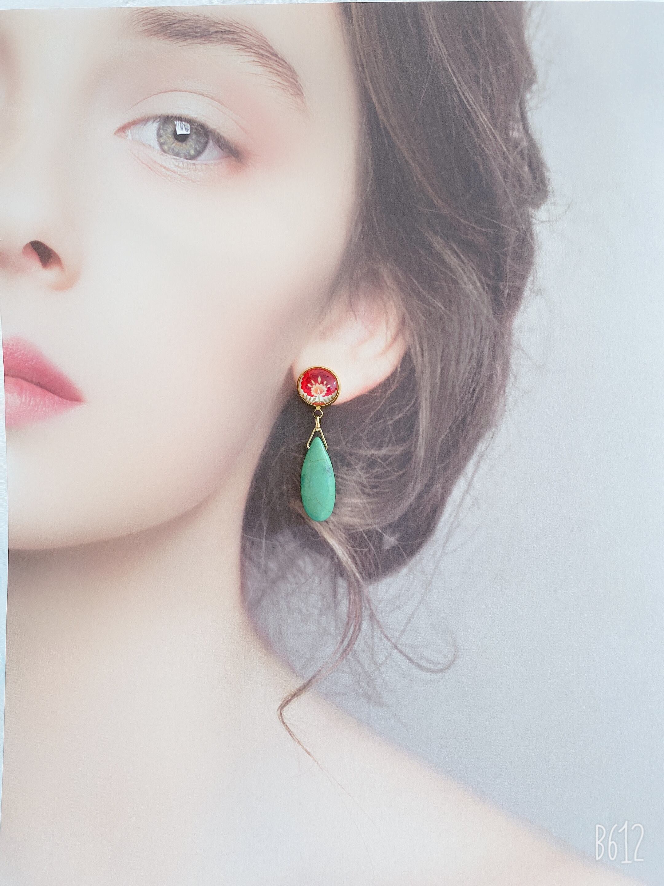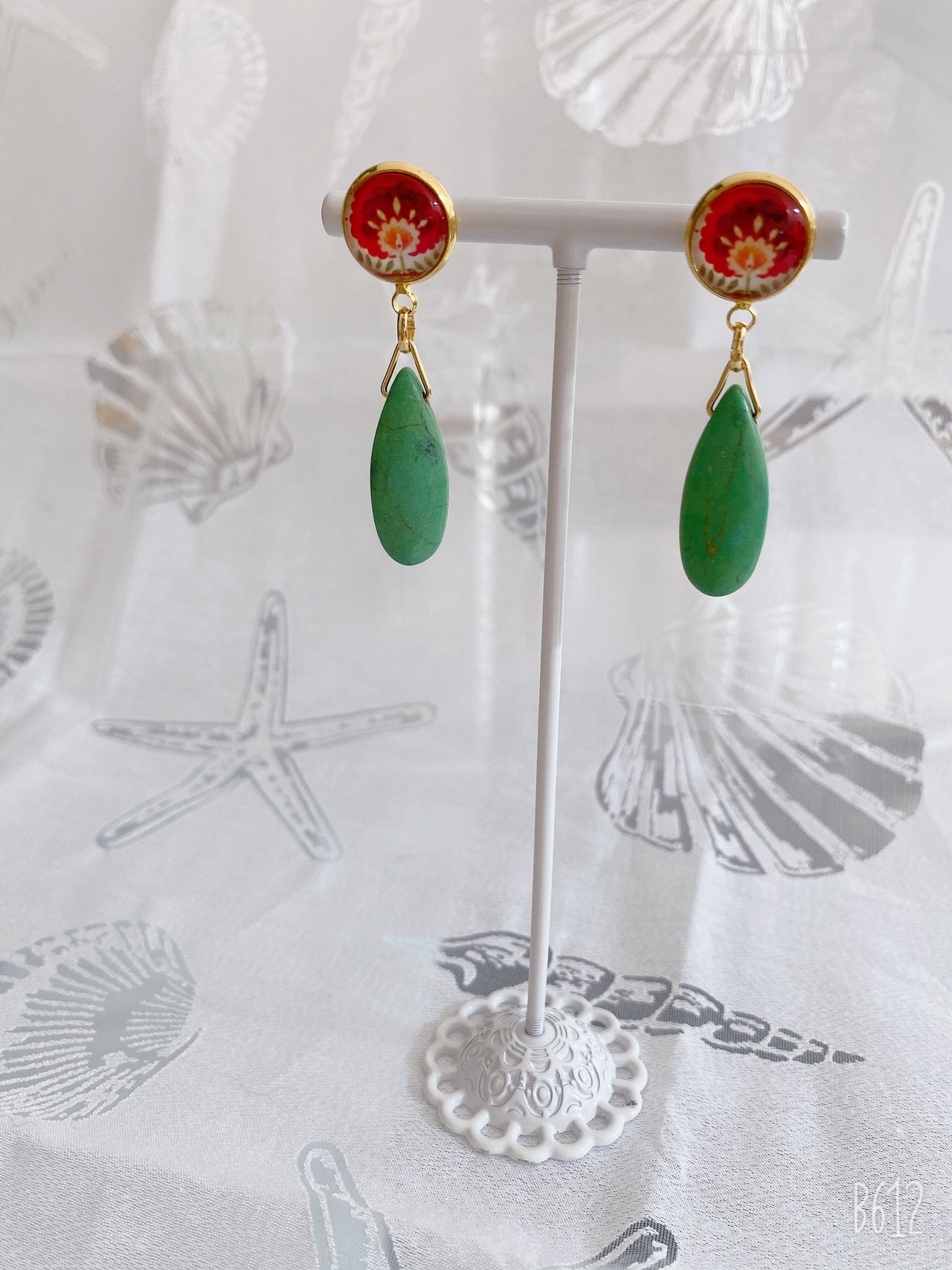 レトロなガラスカボションと練りカラーストーンを使用したピアスです。