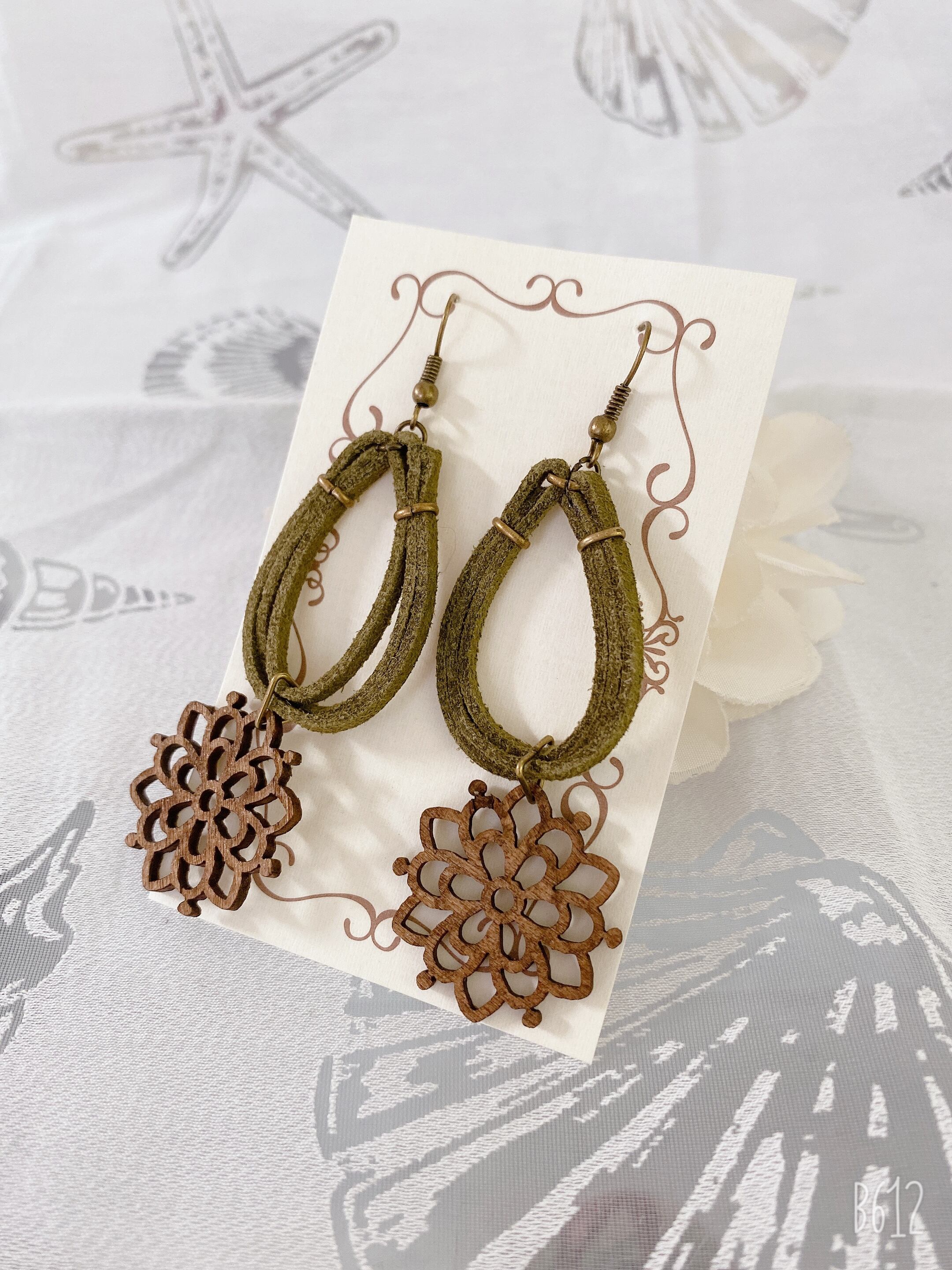 花型ウッドパーツとスウェード紐を使用した